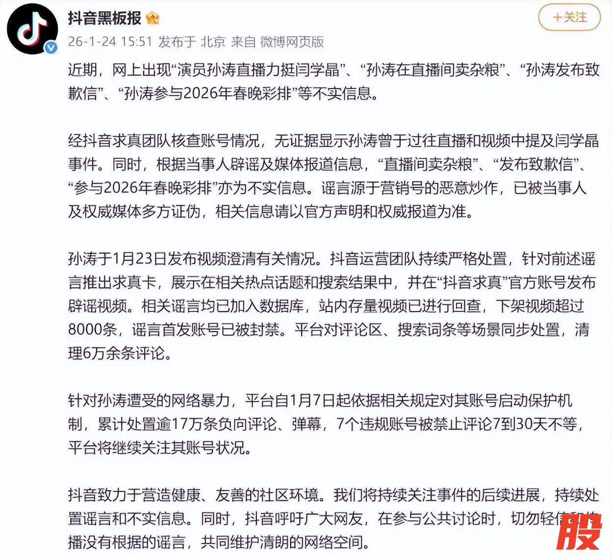 平台方也介入事件。2026年1月24日,抖音官方通过“黑板报”发布核查公告。该公告证实,“孙涛直播力挺闫学晶”、“直播间卖杂粮”等信息均为不实,源于营销号的炒作。公告指出,无证据显示孙涛在直播中提及闫学晶事件,相关谣言通过恶意编辑传播。这一官方回应为事件提供了第三方验证,进一步澄清了事实。