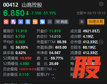 山高控股盘中大跌超50%,现跌51.11%,报价6.85港元,成交额逾4亿港元。