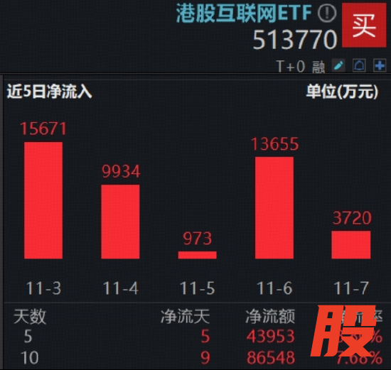 已有巨量资金进场布局,上交所数据显示,港股互联网ETF(513770)上周5日连续吸金,合计达4.4亿元,近10日资金累计净流入8.65亿元。