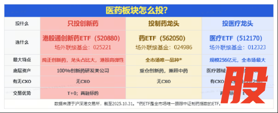 A+H医药资产全线回暖,A股最大医疗ETF(512170)、场内唯一药ETF(562050),以及创新药含量100%的港股通创新药ETF(520880)等热门ETF集体涨超1%。