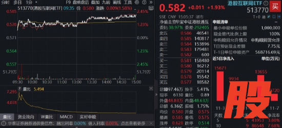 港股全天走强,恒指、恒科指涨逾1%,互联网龙头涨势突出,腾讯控股、阿里巴巴-W、快手-W均涨超2%。重仓互联网龙头的港股互联网ETF(513770)场内价格一度涨逾2%,收涨1.93%,向上收复5日线,全天成交额6.36亿元。