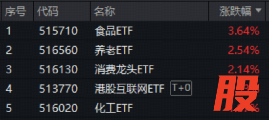 盘面上,大消费概念全线爆发,“茅五泸汾洋”白酒集体猛攻,食品ETF(515710)场内价格猛拉3.64%,收盘涨幅霸居全市场ETF第八;养老ETF(516560)场内价格拉升2.54%,此前5日连续获资金净流入;消费龙头ETF(516130)场内价格劲涨2.14%,一举收复5日、10日、20日、60日四根均线。